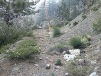 The Fish Fork Trail is located south of Wrightwood, running from Prairie Fork, along Pine Mountain Ridge, and down into Fish Fork. The trail starts near the entrance of Lupine Campground and travels up Pine Mountain Ridge with the Pine Mountain Ridge Trail. At the top of the ridge, the Fish Fork Trail traverses down to the east, toward Fish Fork. Since the trail is poorly maintained from this point on, sometimes it is easier to simply cut across the side of the mountain and drop directly down into the canyon above Fish Fork, bypassing the long switchbacks on the side of Pine Mountain Ridge. If you manage to find your way to this canyon, drop straight down to the trail's intersection with the Dawson Peak Trail. There are small campsites in this area as well as a creek as a water source. If you're feeling adventurous and don't mind climbing through the overgrown vegetation on what's left of the trail, continue down to the actual Fish Fork, at the base of Mt Baldy and Iron Mountain.